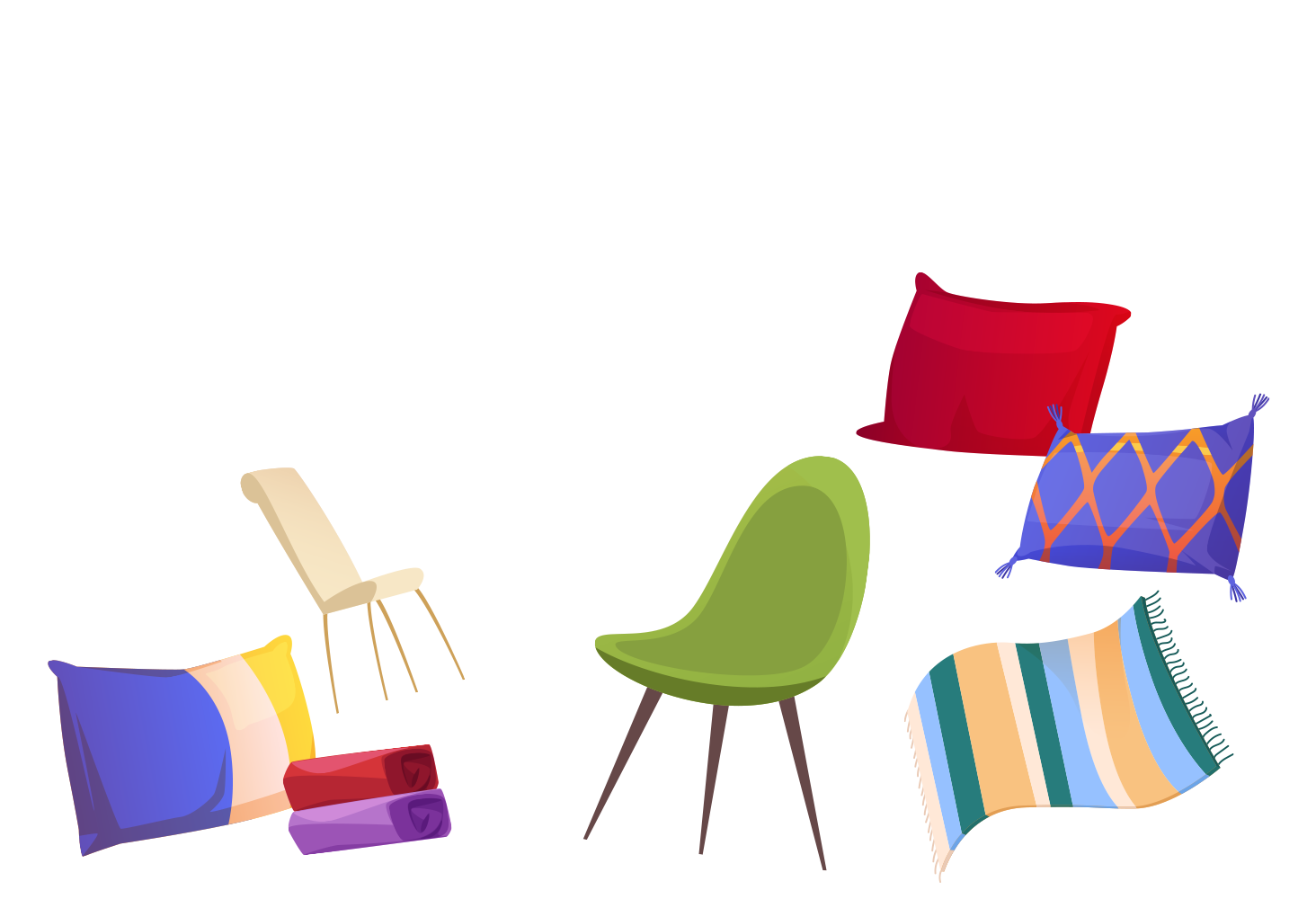 Bej veya açık gri duvarlar üzerinde retro renkli koltuklar, dengeli bir görünüm sağlar.