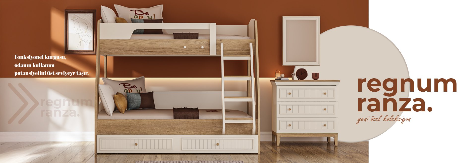Regnum ranza sistemi, alan tasarrufu sağlayan yapısı ve güçlendirilmiş taşıyıcı sistemi ile güvenli ve uzun ömürlü kullanım sunar. Çocuk odalarında hem fonksiyonel hem estetik bir çözüm oluşturur.