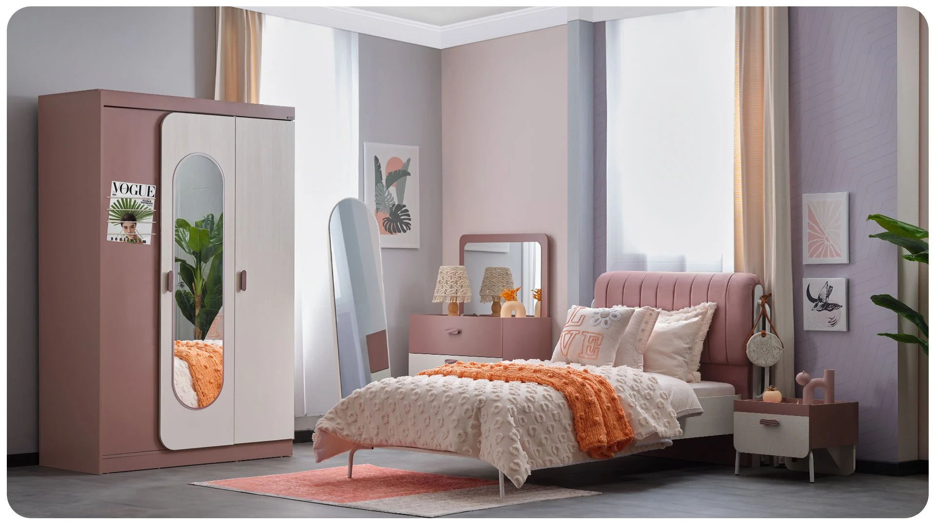 3 Kapaklı Dolap + 100x200 Karyola + Çalışma Masası + Komodin + Dolap İçi Çekmece