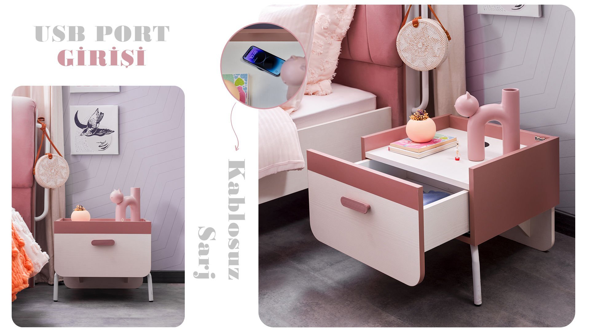 * Komodin üstü kablosuz şarj özellikli usb port