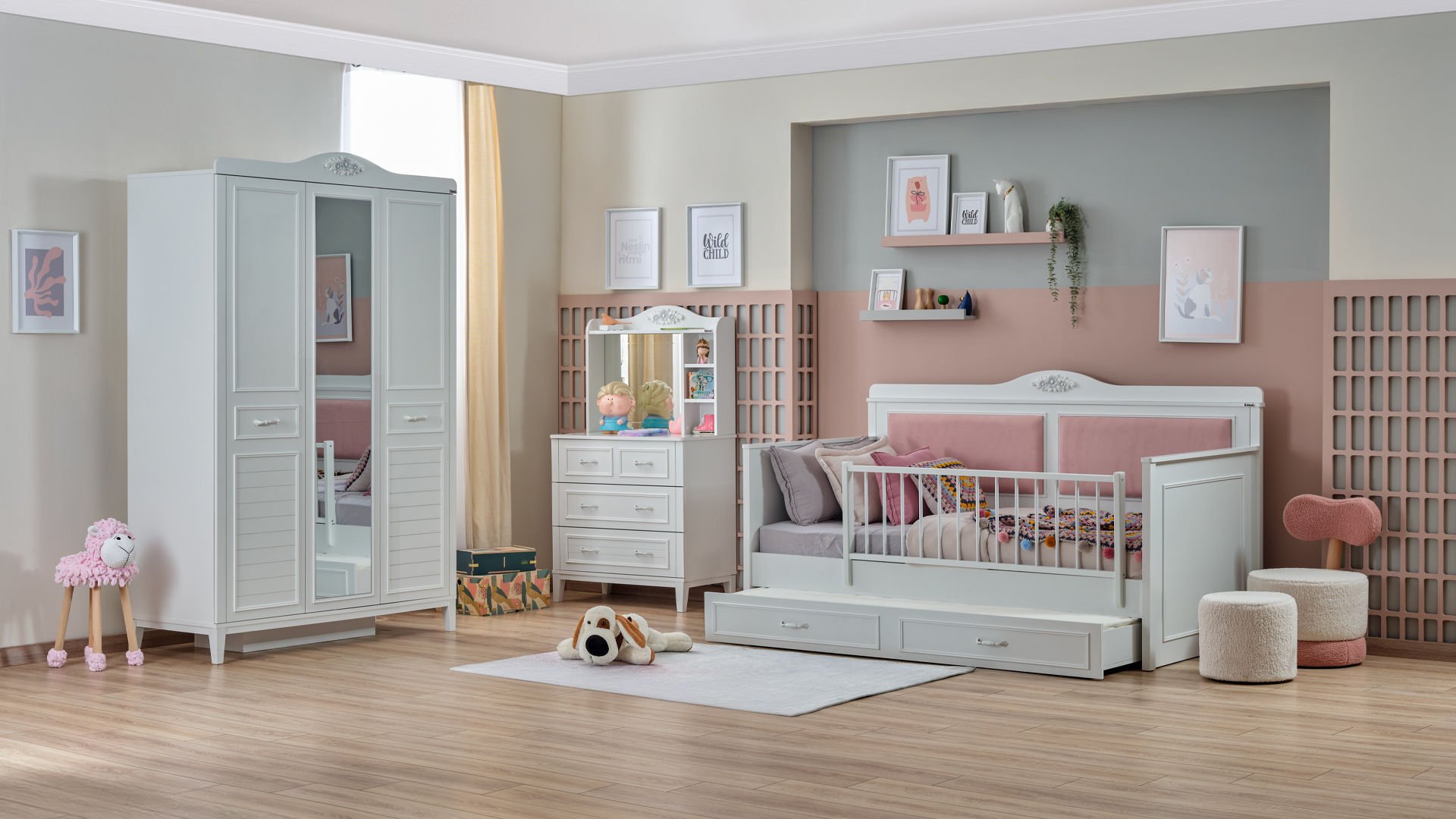 3 Kapaklı Dolap - Aynalı Şifonyer - Montessori 100x200(Alt Karyola)