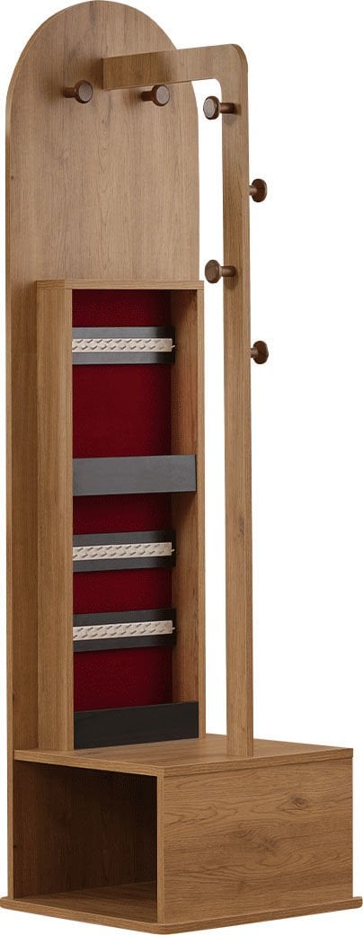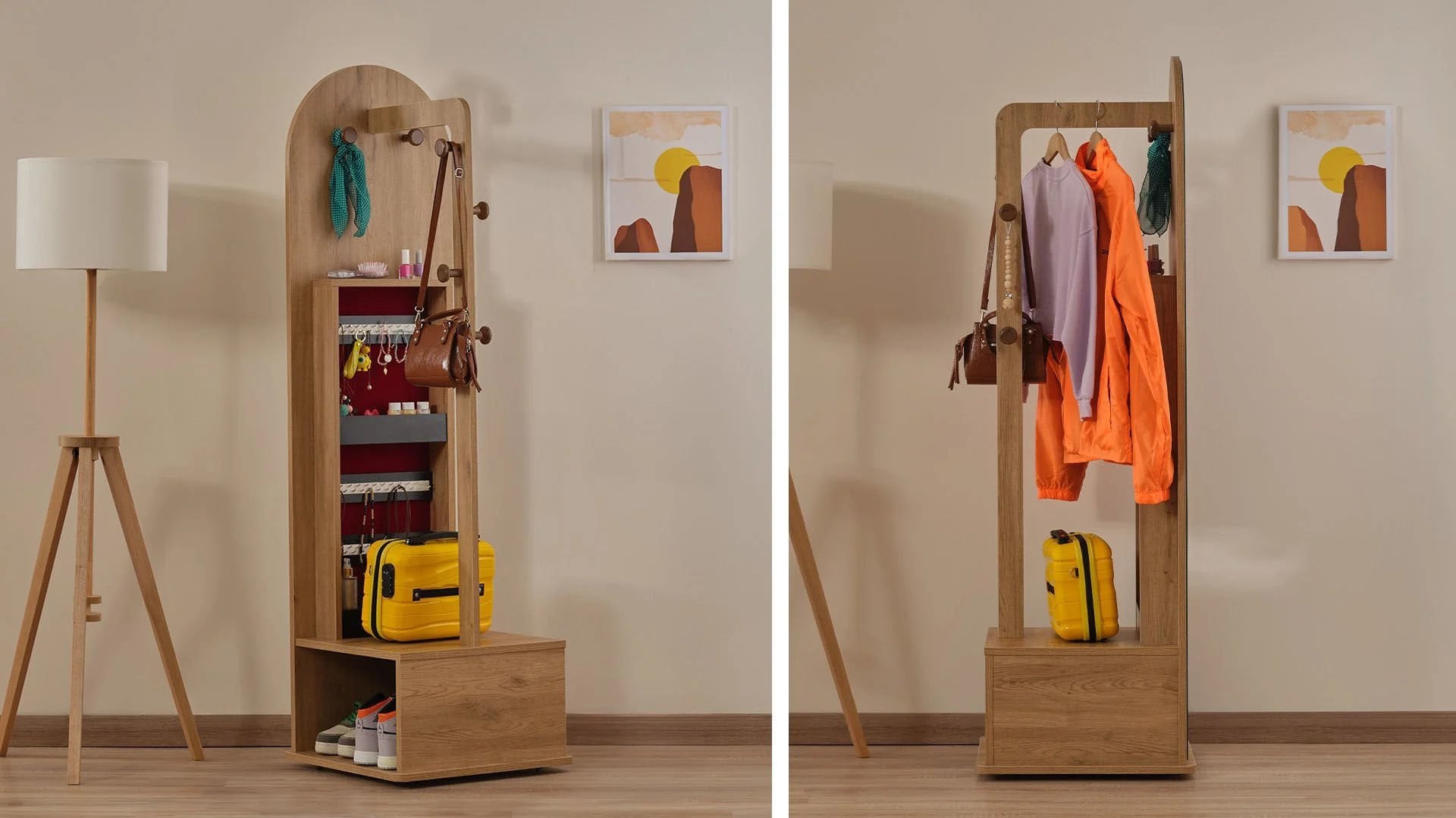 * Eşyalarınızı asabileceğiniz ahşap tasarım askılıklar ve açık gözlü depolama alanı.