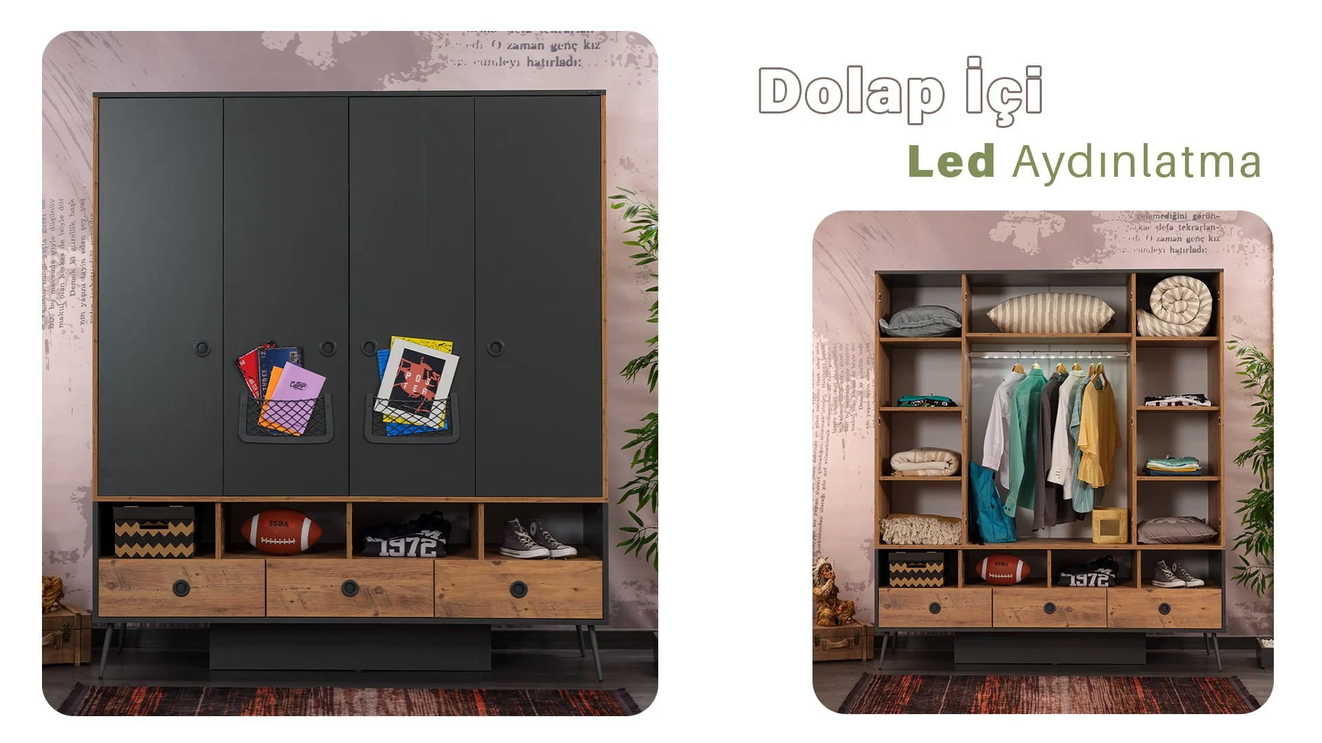 Ölçüler: Genişlik: 134 cm | Yükseklik: 203 cm | Derinlik: 59 cm | Dolap İçi Derinlik: 54 cm