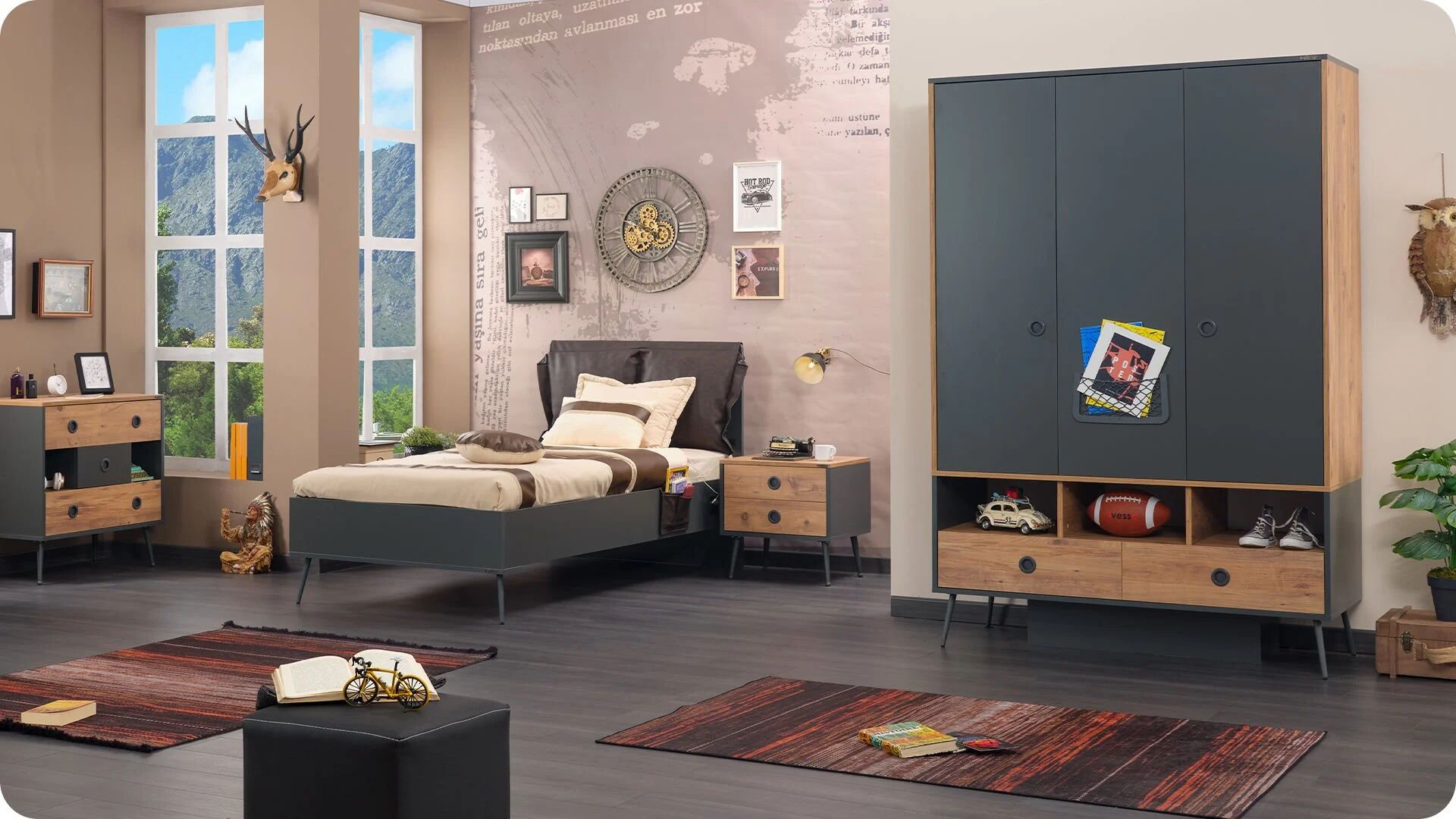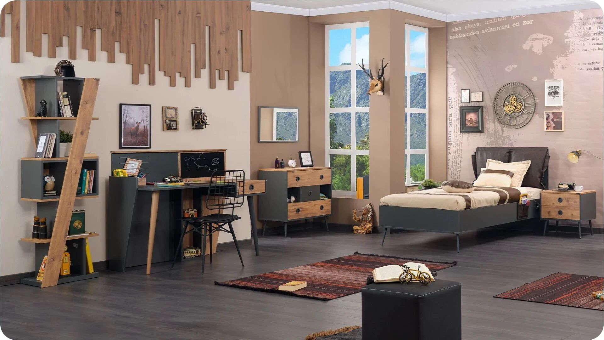 3 Kapaklı Dolap + 100x200 Karyola + Çalışma Masası + Kitaplık + Şifonyer ve Aynası + Komodin