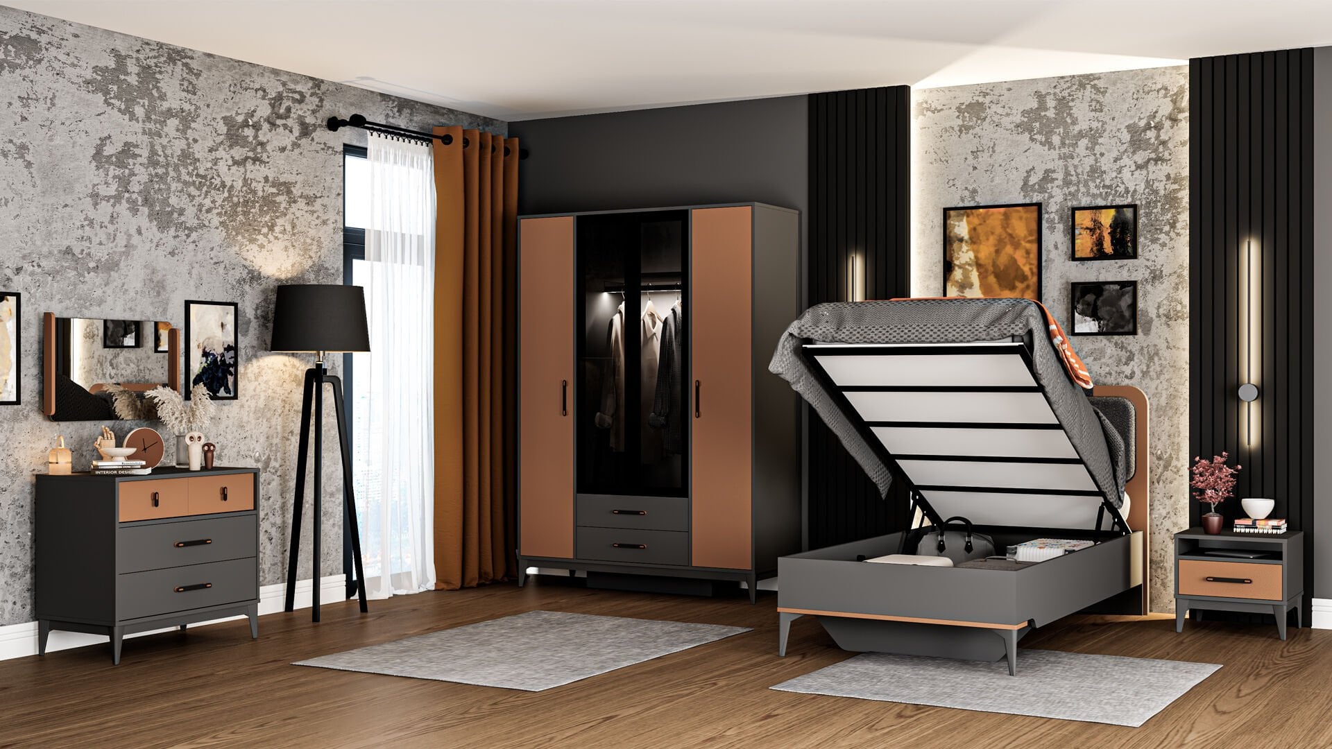 Parla Şifonyer ve Aynası, modern tasarım detayları ve fonksiyonel yapısıyla genç odalarında hem şık hem kullanışlı bir alan oluşturur. Geniş depolama alanı sunan şifonyer ve tamamlayıcı ayna tasarımıyla uyumlu bir bütünlük sağlar.