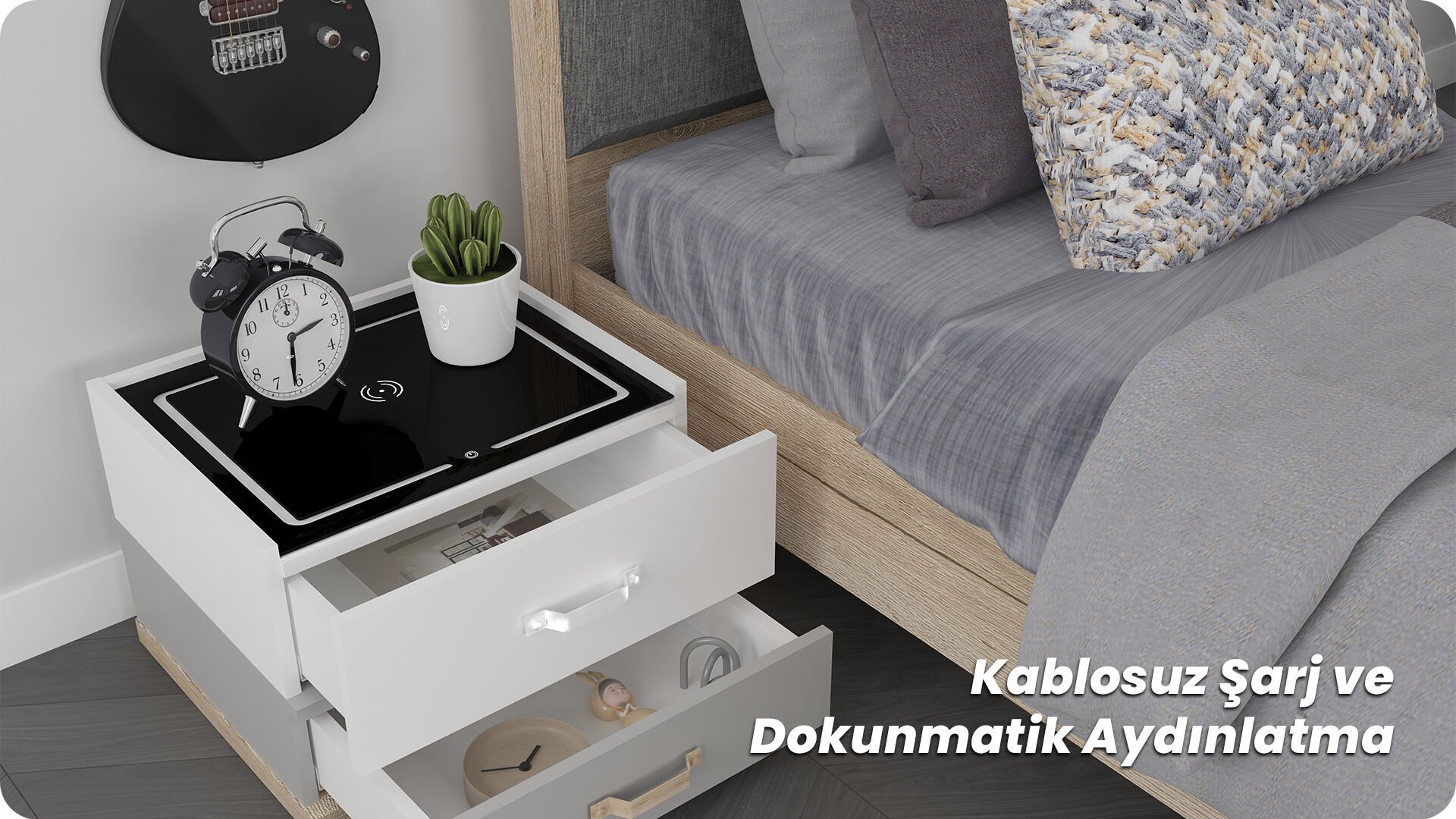 * Üst tabla özel tasarım cam kablosuz şarj ve dokunmatik led aydınlatma