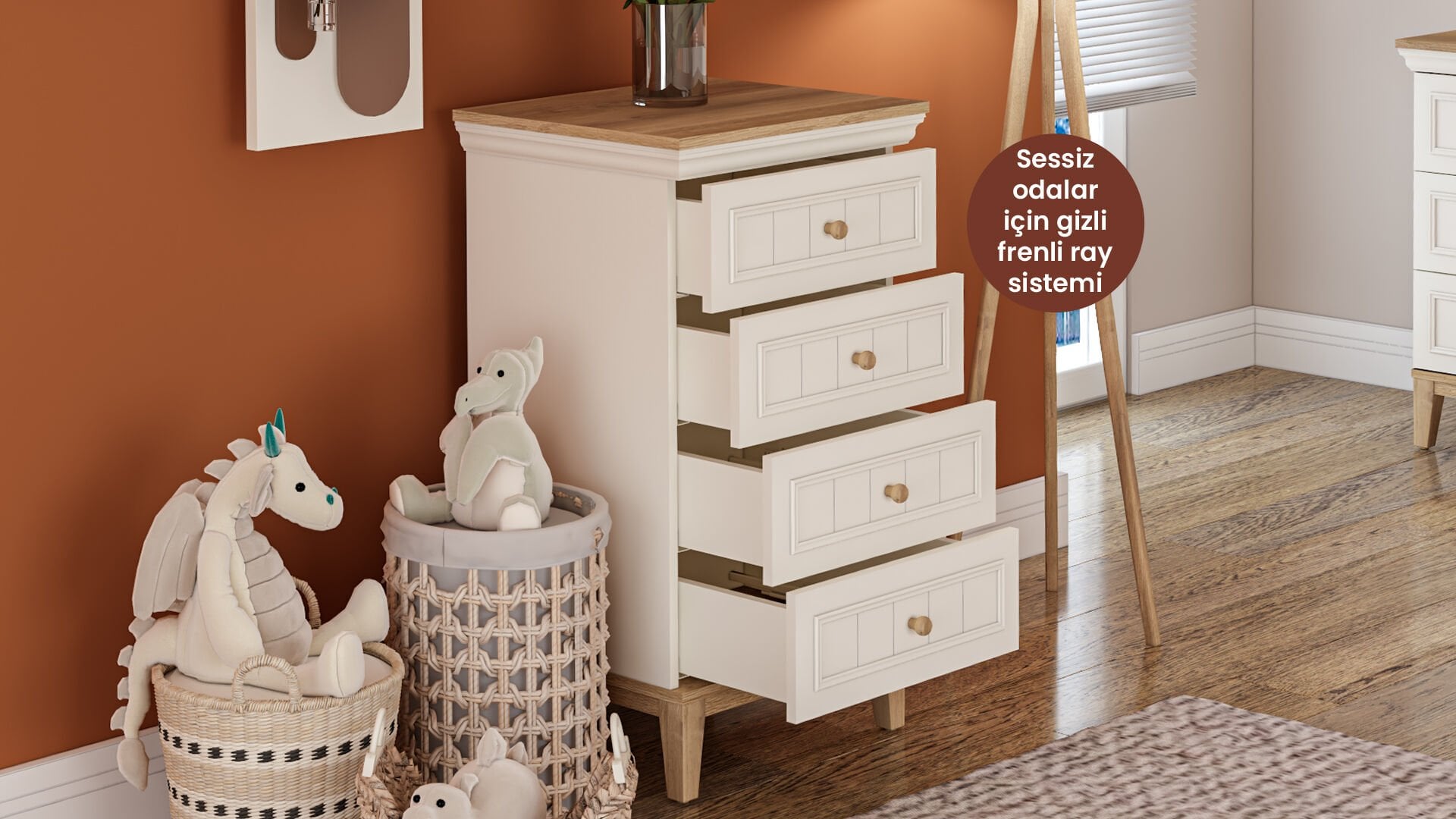 - Çekmecelerde sessiz ve konforlu kullanım sağlayan gizli frenli ray sistemi